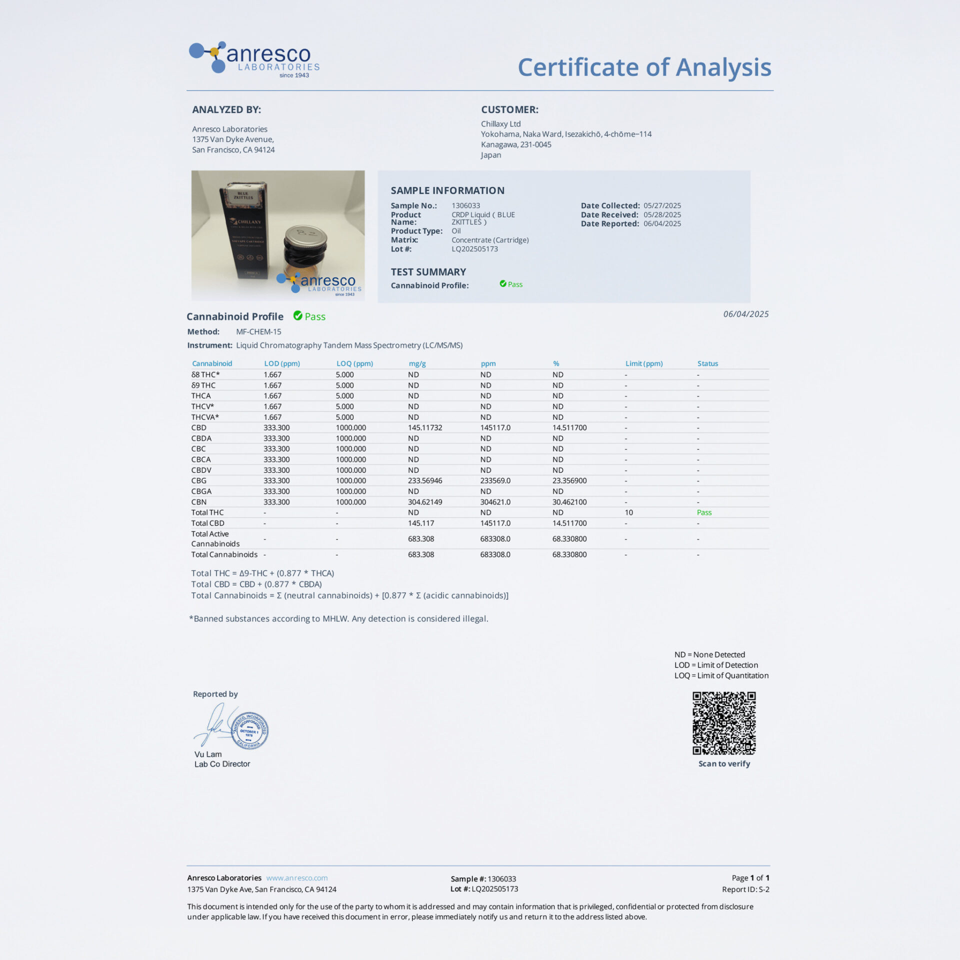 本品はフルカンナビノイドリキッドです。リキッドは、複数のカンナビノイドとその他、植物由来テルペンを使用したチラクシーのハイエンドブレンドです。オリジナル配合による本物の香りをお楽しみいただけます。