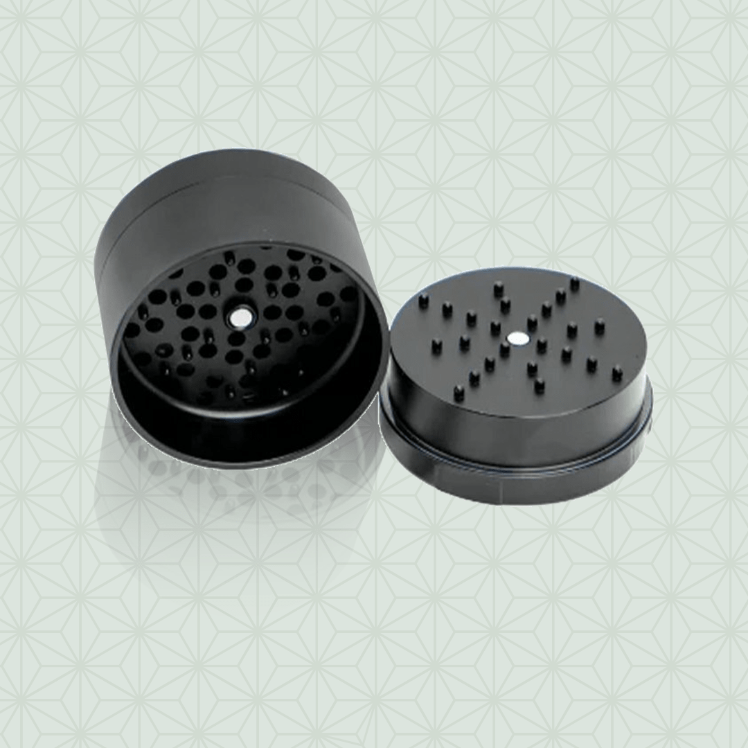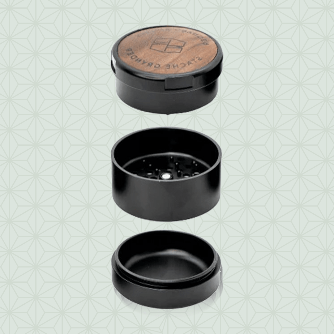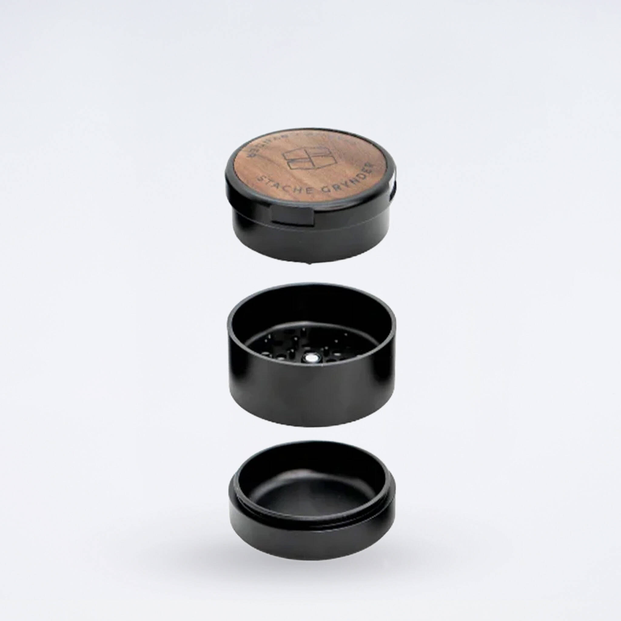刻まずに砕く3ピースグラインダー「STACHE GRYNDER」このグラインダーは切り刻むのではなく、手揉みのように押しつぶし、千切って砕く仕組みです。アメリカの最新研究では成分を壊すことなくハーブを砕くにはグラインダーの歯の形が重要とのことで、この構造のグラインダーが話題となりました。メッシュを採用していないため、通常のグラインダーよりもキーフが溜まりやすくなっています。