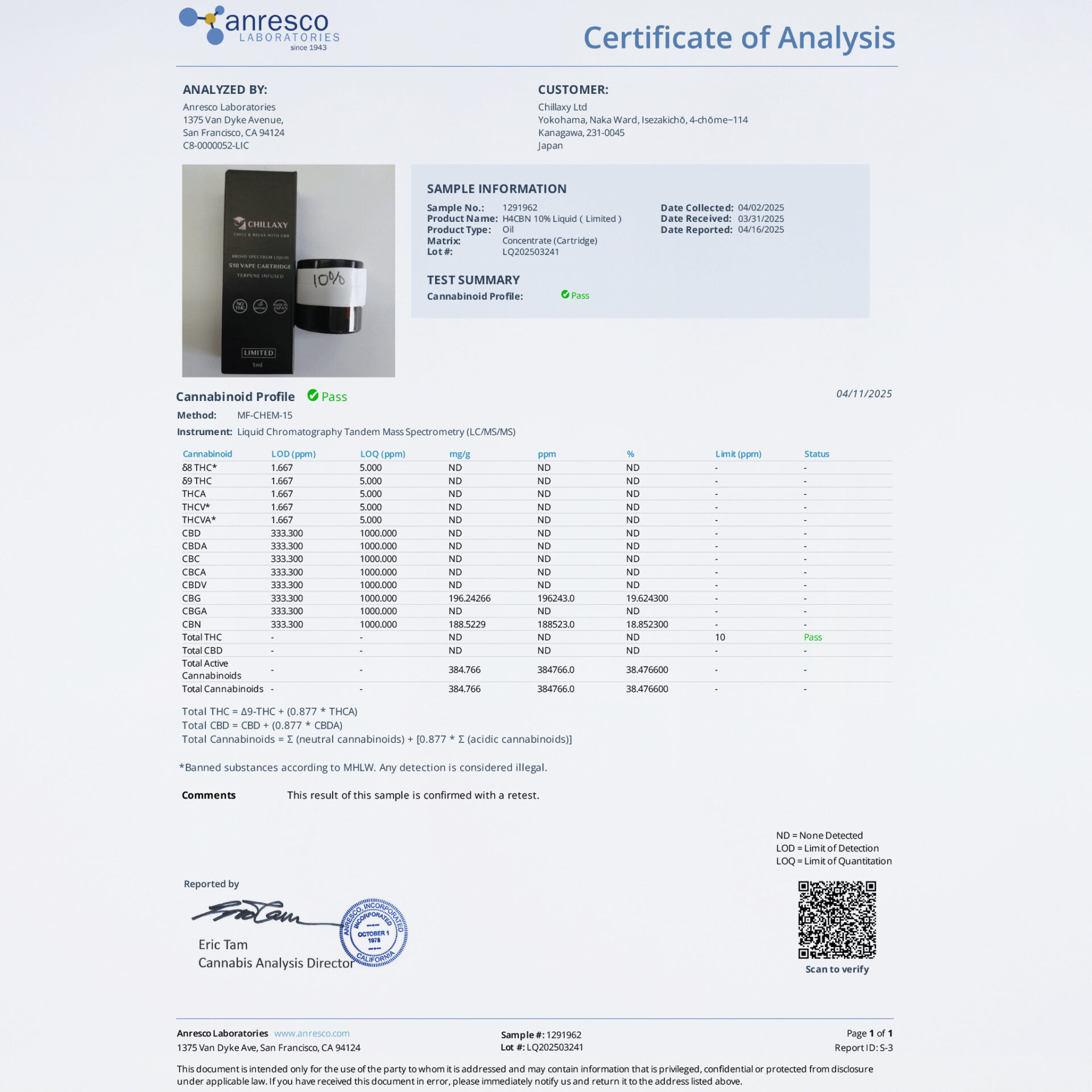 ・カンナビノイド濃度 :H4CBH 15%,CBN 35%,CBD 25%,CBG 10%,MCT 10%,Terpene 5%(Banana Smoothie)