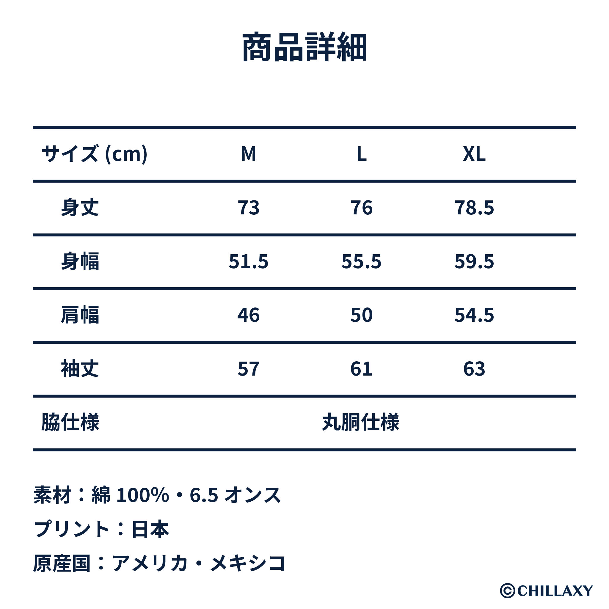 ・M:身丈73、身幅51.5、肩幅46、袖丈57