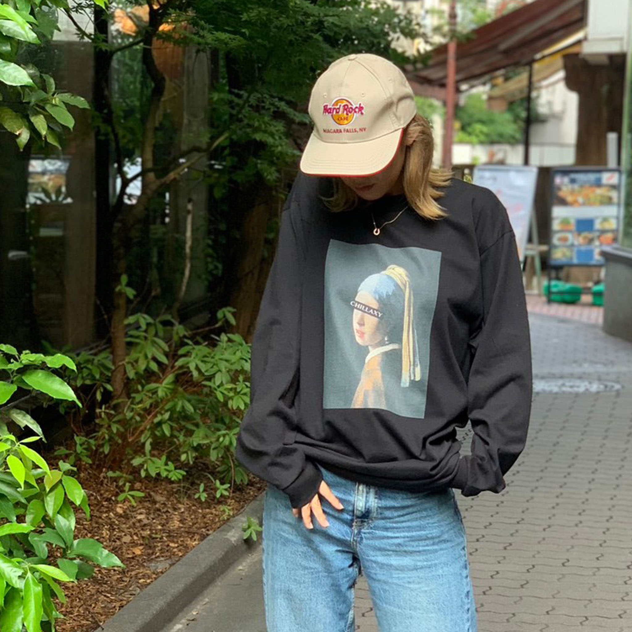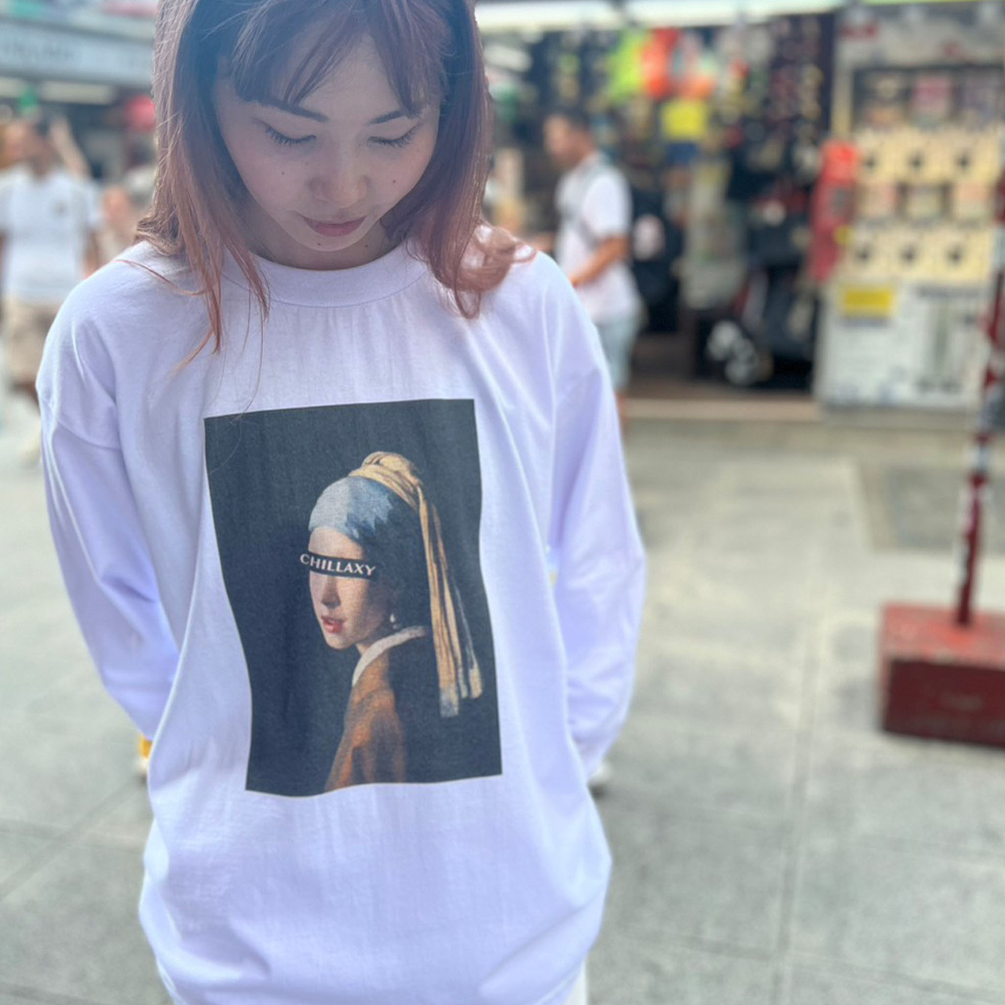作品『真珠の耳飾りの少女』の神秘的に微笑む少女の美しい眼差しにCHILLAXYボックスロゴをプリント。