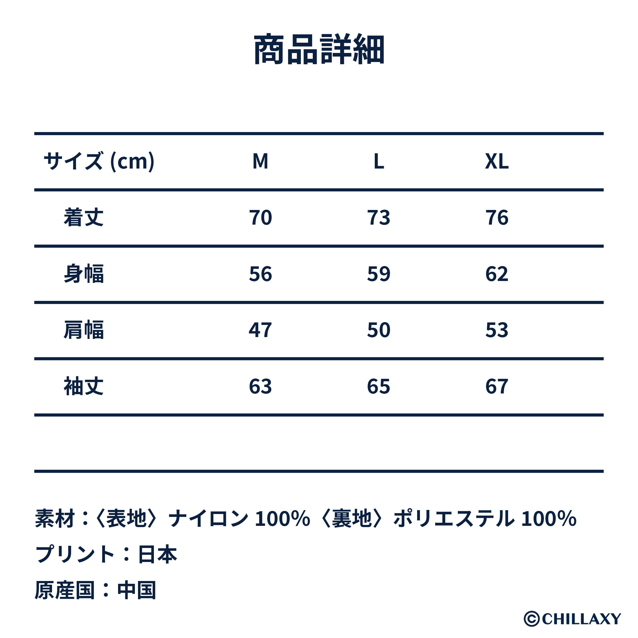 ・XL:着丈76、身幅62、肩幅53、袖丈67