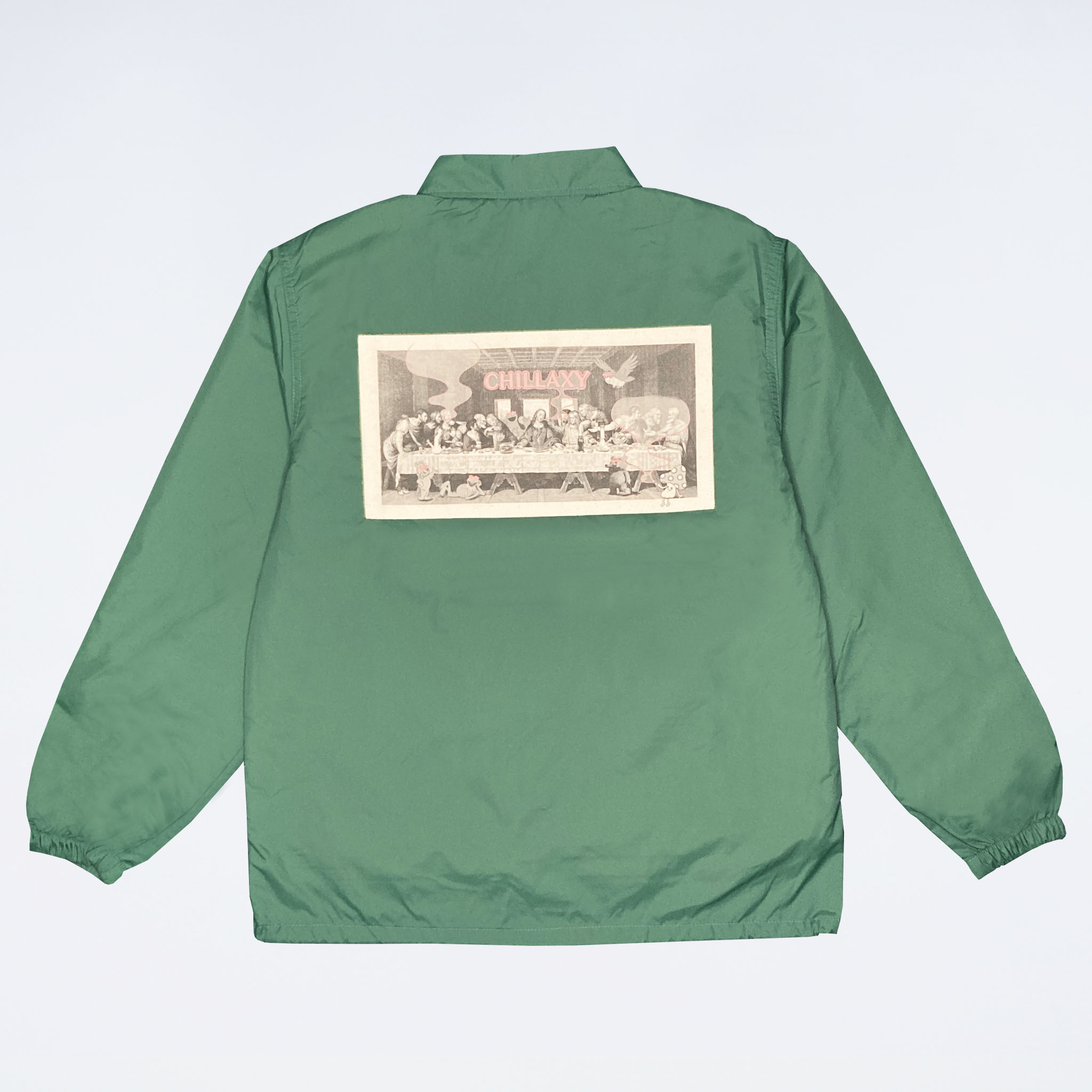 イラストレーター・小鳥遊しほによるデザイン「最後の晩餐」×ポップなキャラクターがチルパーティーしているデザインを背面にプリント。胸元にはチラクシーのロゴをプリント。