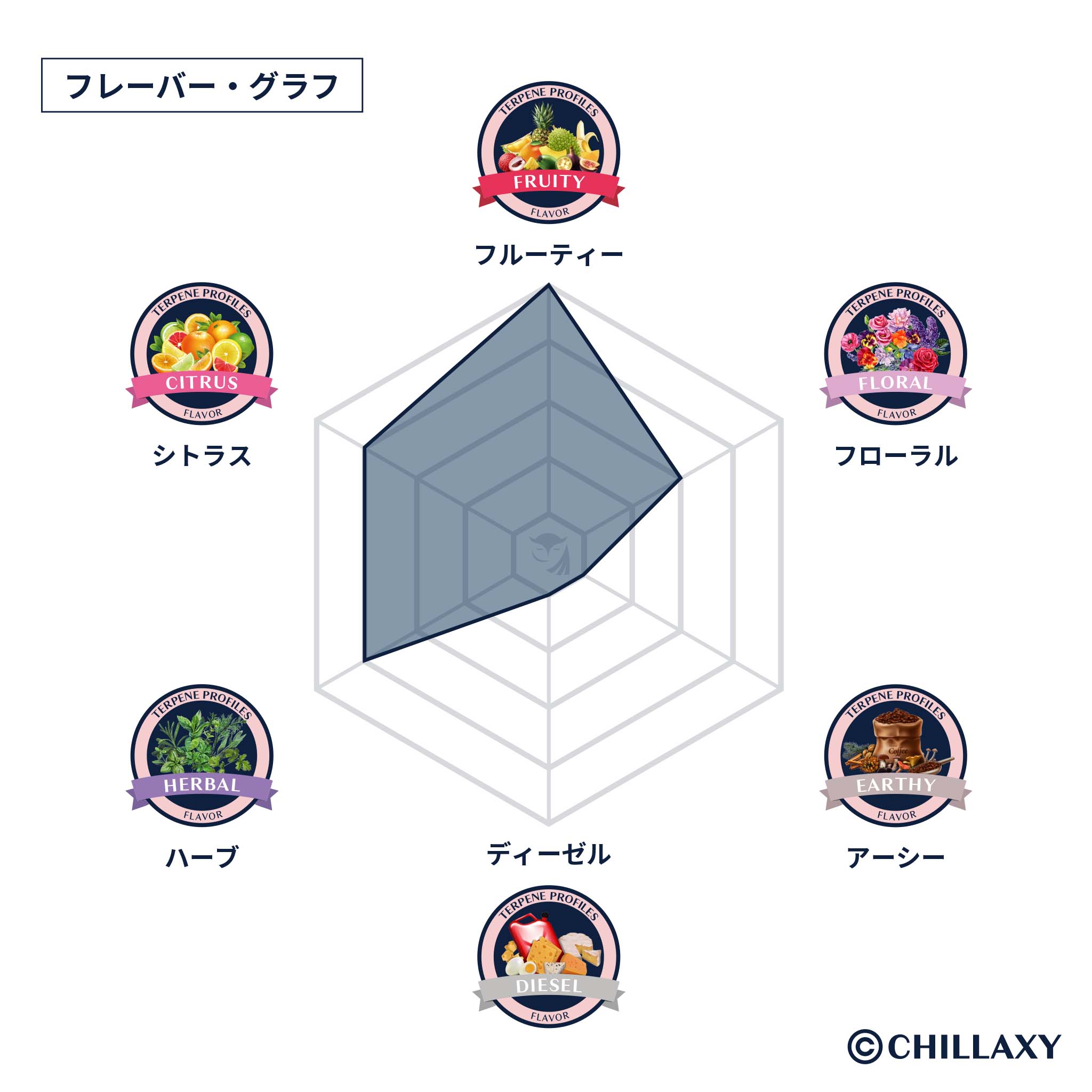 Blue DiamondとZkittlez品種を掛け合わせたインディカ種「ブルースキットルズ」のライブレジンフレーバーを使用したフルカンナビノイドワックスです。ブロードスペクトラムCBDとCBN、CBGを配合し、ライブレジンと植物由来のテルペンをベースにしたワックスです。アロマフレーバーは、新鮮なベリーと柑橘系を感じる甘酸っぱいベリー・キャンディのようなフレーバーです。気持ちを和ませ、まったりしたいときに適しています。本品を使用するには、別売りのCBDワックス専用のベポライザーが必要です。