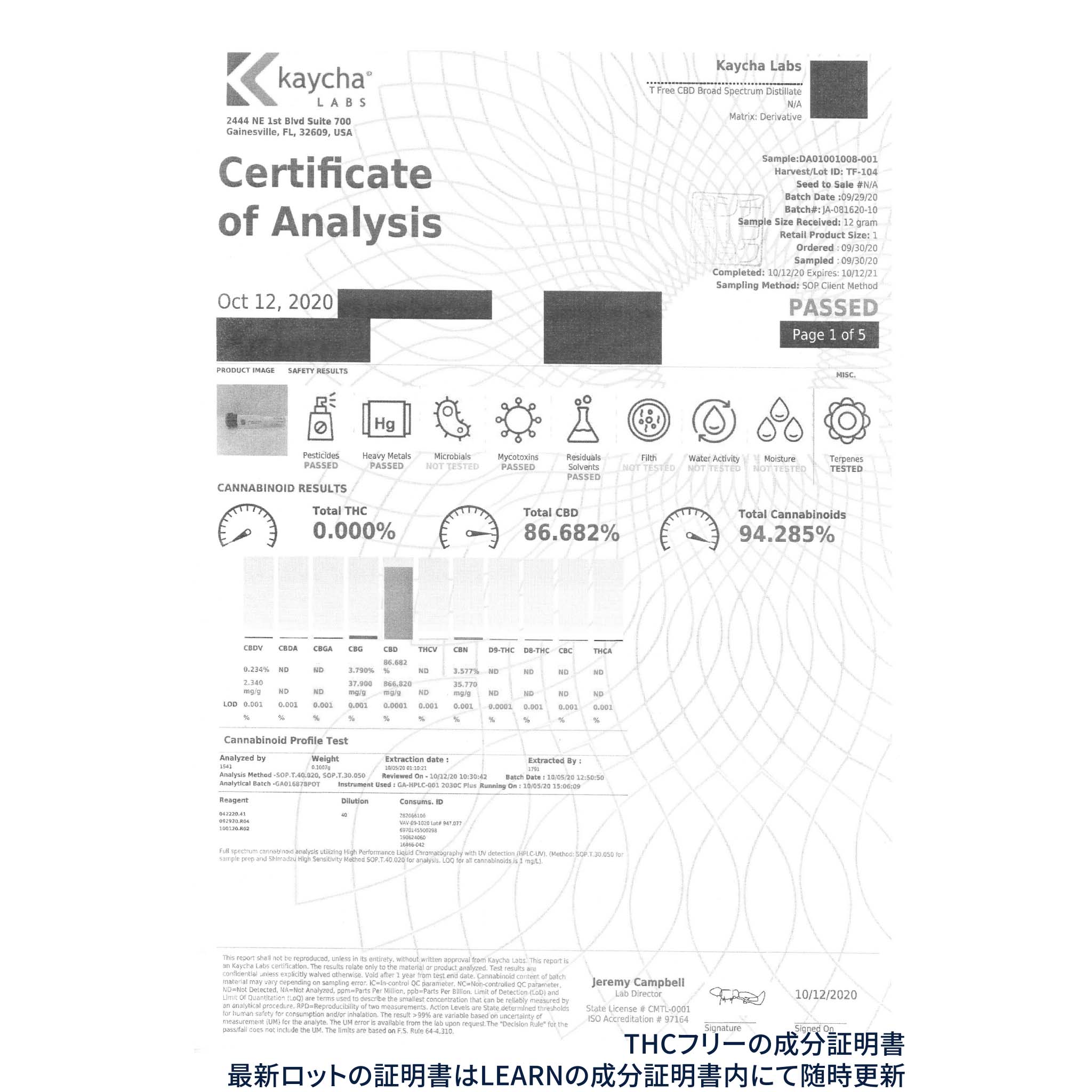 ・カンナビノイド濃度 90%以上:CBN 42.0%、CBG 40.1%、CBD及びその他麻抽出物 9.9%、テルペン 8.0%