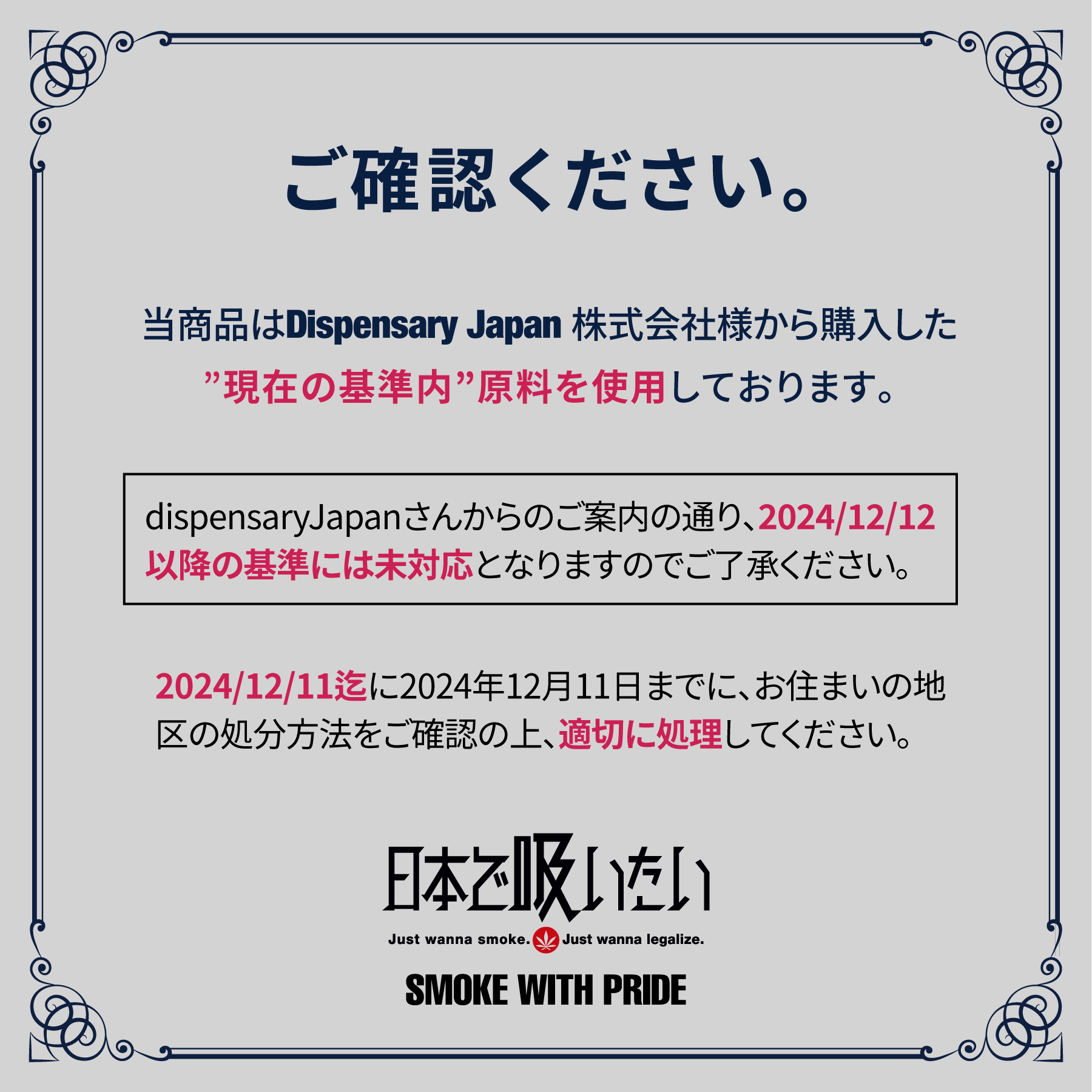 本品を使用するには、510規格のベイプバッテリーが必要です。リキッドカートリッジのリキッド切れは、空焚きの原因となりますので、リキッドが完全に無くなる前に取り換えてください。オイル漏れ防止のゴムキャップとゴム栓を取り外してからご使用ください。開封後は、お早めにご使用ください。温度により色、フレーバー、粘度等に変化が生じる場合がございますが、品質に問題はありません。化粧箱は、逆立てたり横倒しにしたりせず、立てた状態で保管してください。本品は20歳以上の方の利用を想定しております。幼児の手の届かない所に保管してください。低量の摂取からはじめ、体調や体質によって合わない場合、使用を中止してください。妊娠中または、授乳中の方は使用しないでください。薬を服用している方、持病のある方は医師にご相談の上、ご使用ください。本品の摂取と車の運転や重機の操作を一緒にしないでください。本品は高濃度カンナビノイドのため、カンナビノイドが結晶化する場合がございますが、品質に問題はありません。本品を使用する前に、同封されている「カンナビノイド製品の注意事項」を必ずお読みください。メリットとリスクを理解した上で、十分にご注意いただき、あらかじめご了承のうえ、ご利用ください。