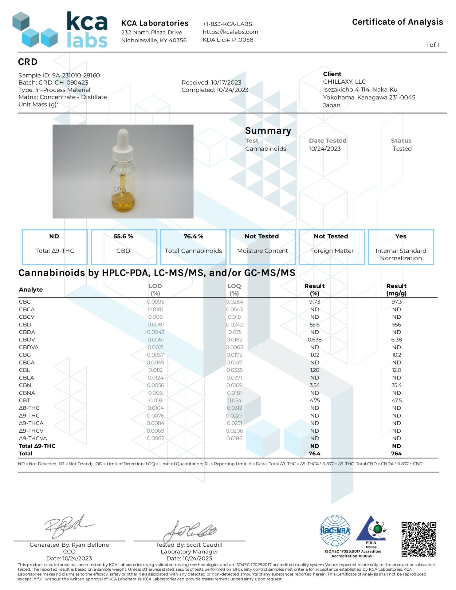 カンナビノイド濃度 90%以上:CNP 36.0%、CBN 16.2%、CBG 15.3%、CBC 3.0%、CBT 1.8%、CBD及びその他麻抽出物 19.7%、テルペン 8.0%