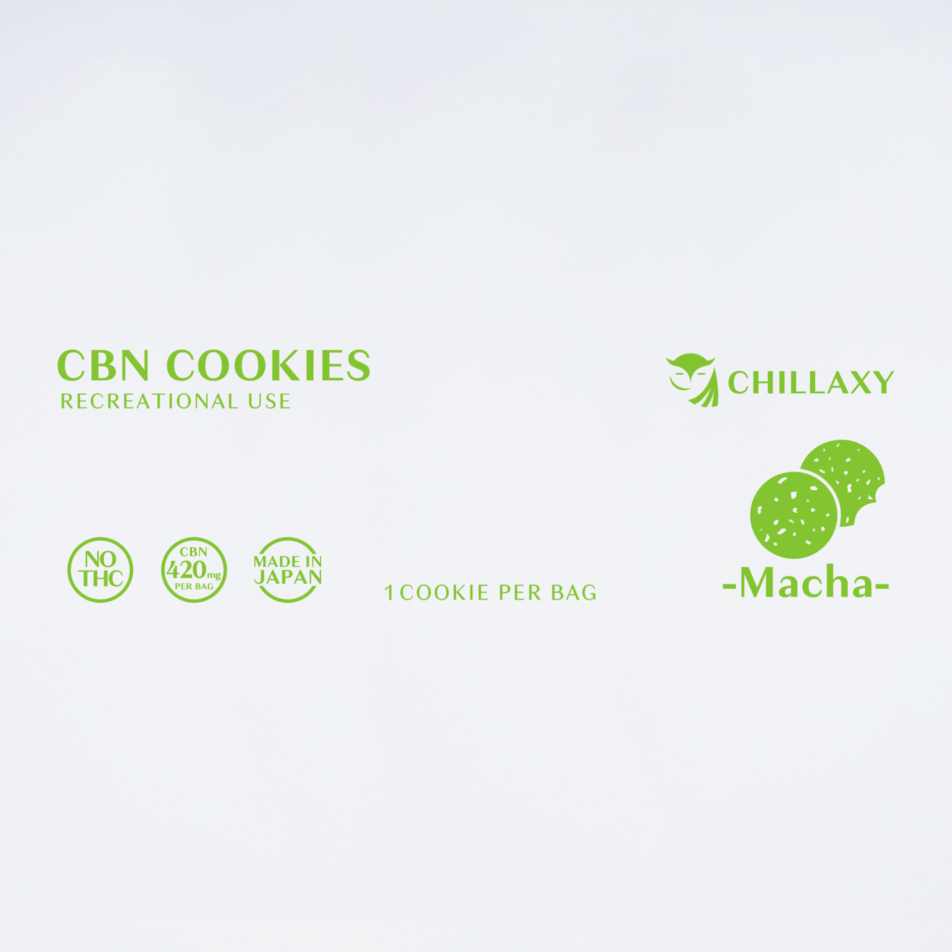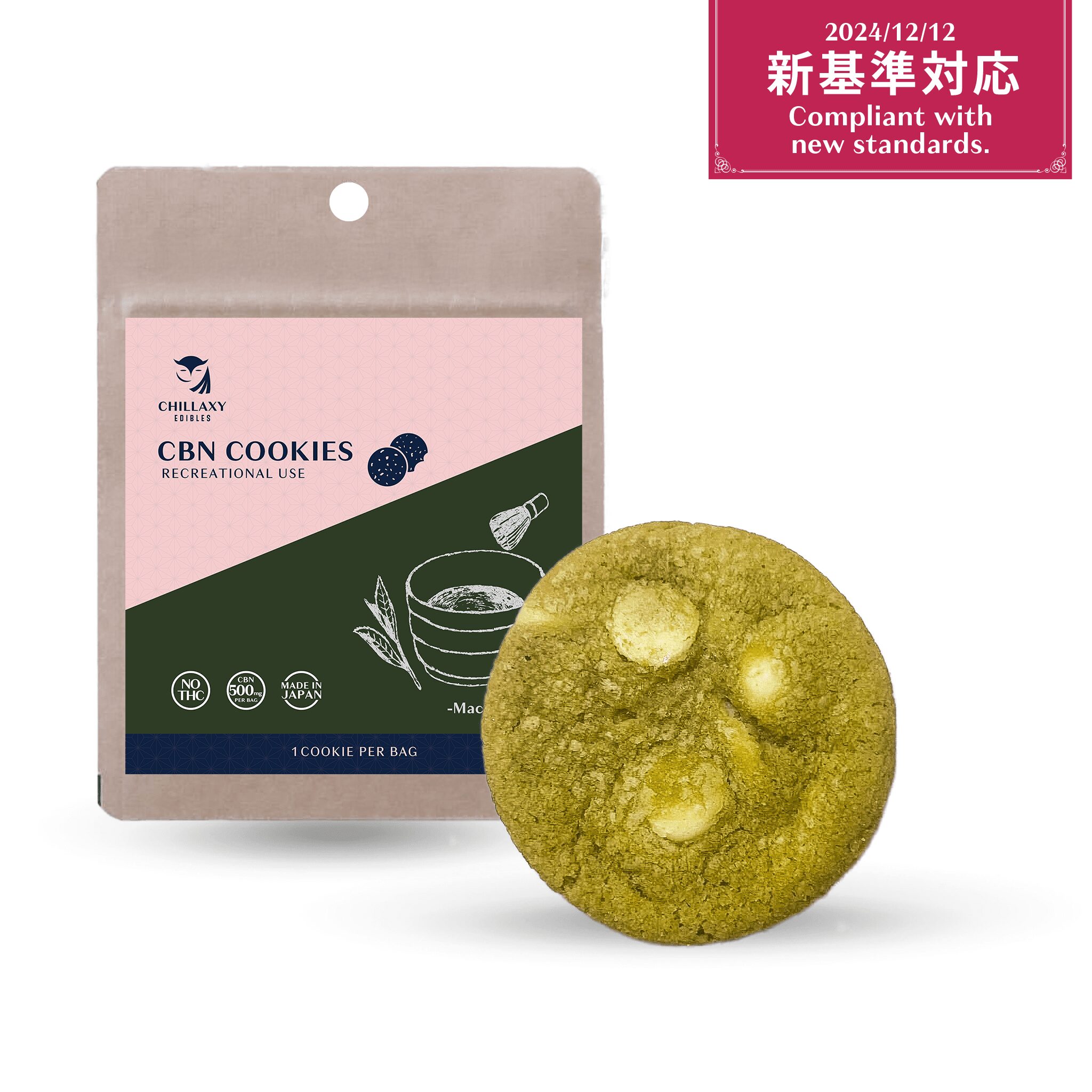 クッキー1枚にCBN 420mgを配合した高濃度CBNクッキーです。抹茶の苦味とホワイトチョコレートの甘さが絶妙に調和した上品な味わいをお楽しみいただけます。高濃度CBNと食べごたえのあるボリュームのため、数回に分けてお楽しみいただけます。半枚食べると心地よいまったり感を得ることができるレクリエーション性があります。
