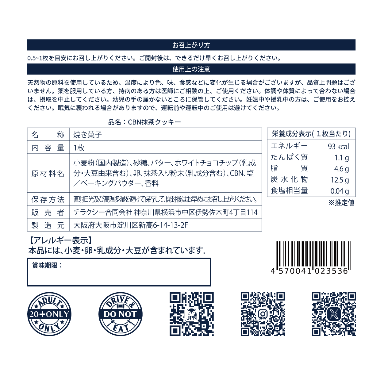 ・原材料:小麦粉(国内製造)、砂糖、バター、ホワイトチョコチップ(乳成分・大豆由来含む)、卵、抹茶入り粉末(乳成分含む)、CBN、塩、ベーキングパウダー、香料