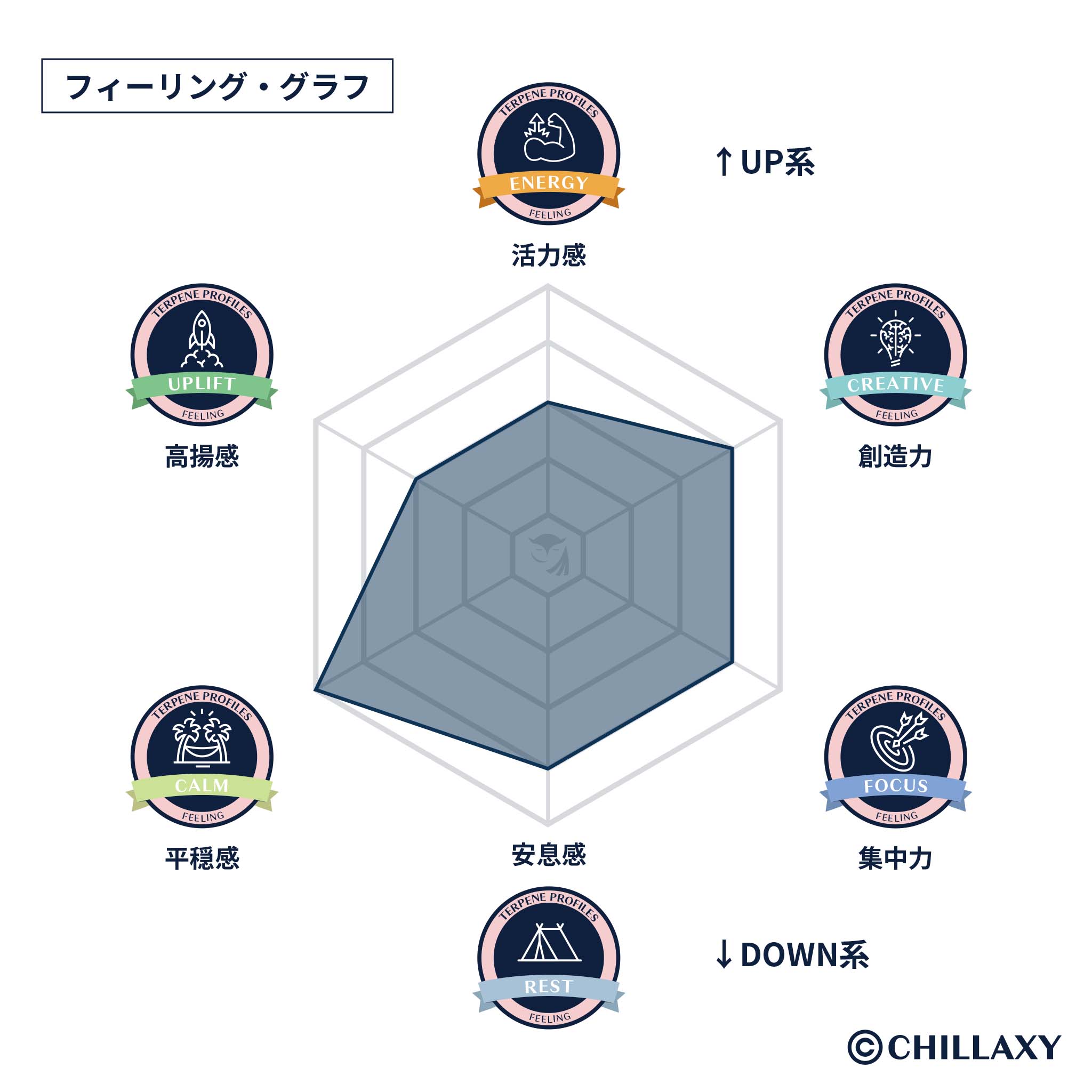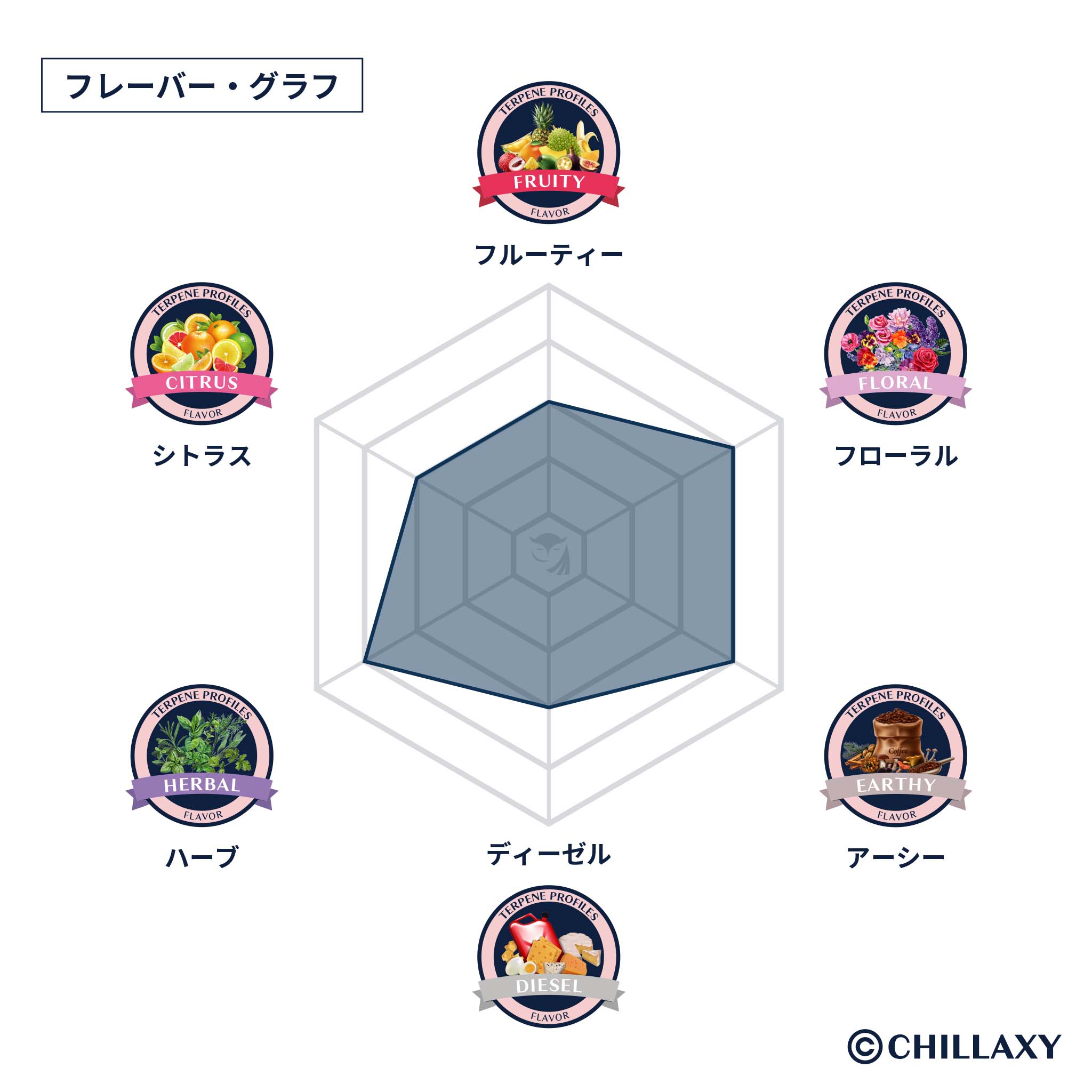 ハイブリッド品種「OGクッシュ」のフレーバーを再現したフルカンナビノイドリキッドです。リキッドは、複数のカンナビノイドと麻以外の植物由来テルペンのみを使用したチラクシーのハイエンドブレンドです。アロマは、土っぽさとパインウッドの香りがミックスしたワイルドなフレーバーです。リラックスしながらモチベーションを上げ、集中力を高めたいときに適しています。本品を使用するには、別売りのDART-X バッテリーが必要です。