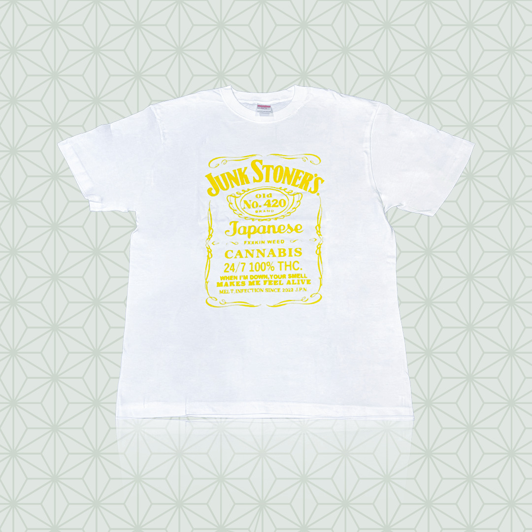 カンナビスカルチャーをストリートファッションに落とし込んだ、JUNK STONER’SのTシャツ。クラシックなラベルデザインを彷彿とさせるグラフィックが特徴的な、遊び心あふれる一枚です。ヴィンテージ感のあるフォントとフレームデザインが、アメリカンレトロな雰囲気を演出します。