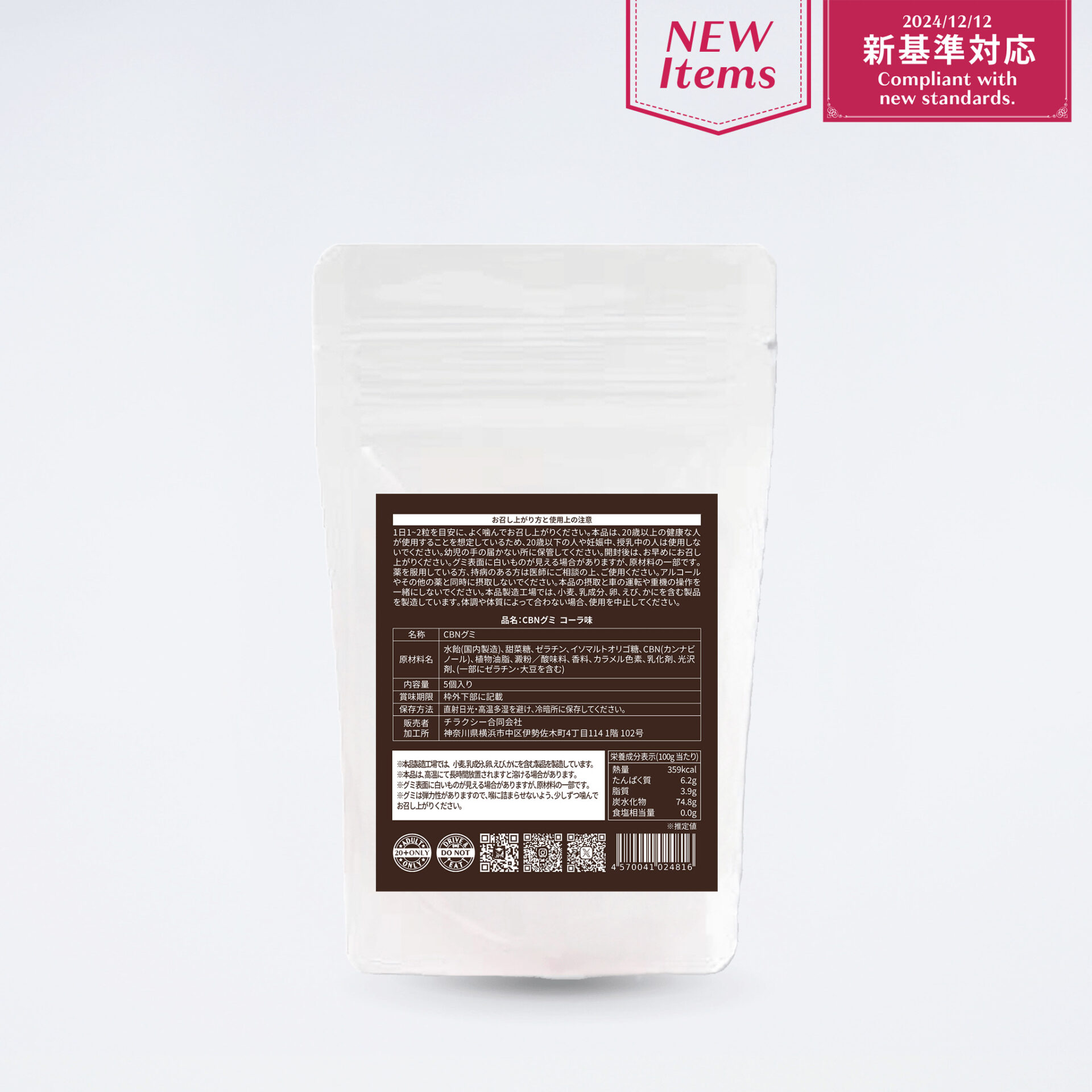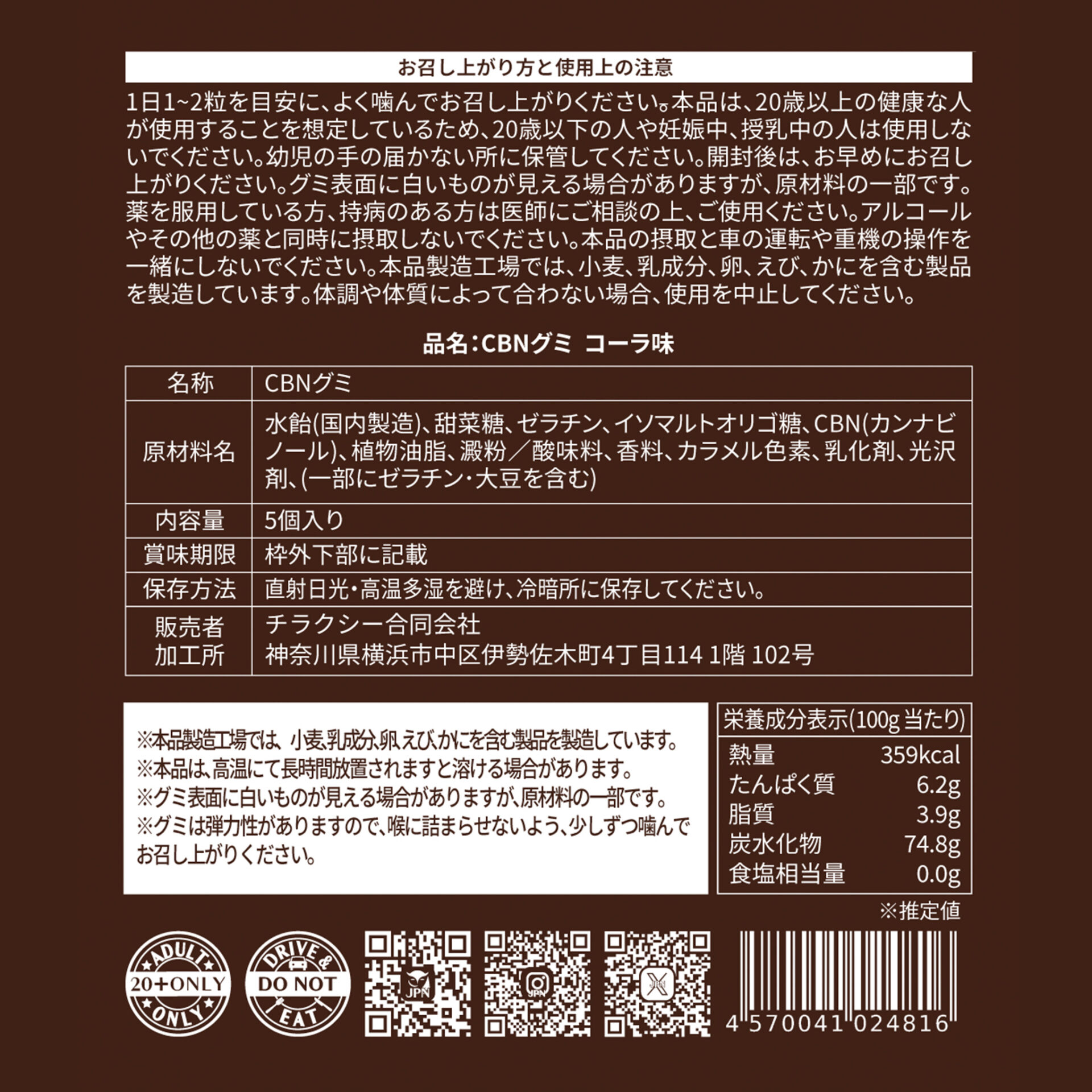 ・原材料:水飴(国内製造)、甜菜糖、ゼラチン、イソマルトオリゴ糖、CBN、植物油脂、澱粉/酸味料、香料、カラメル色素、乳化剤、光沢剤、(一部にゼラチン・大豆を含む)