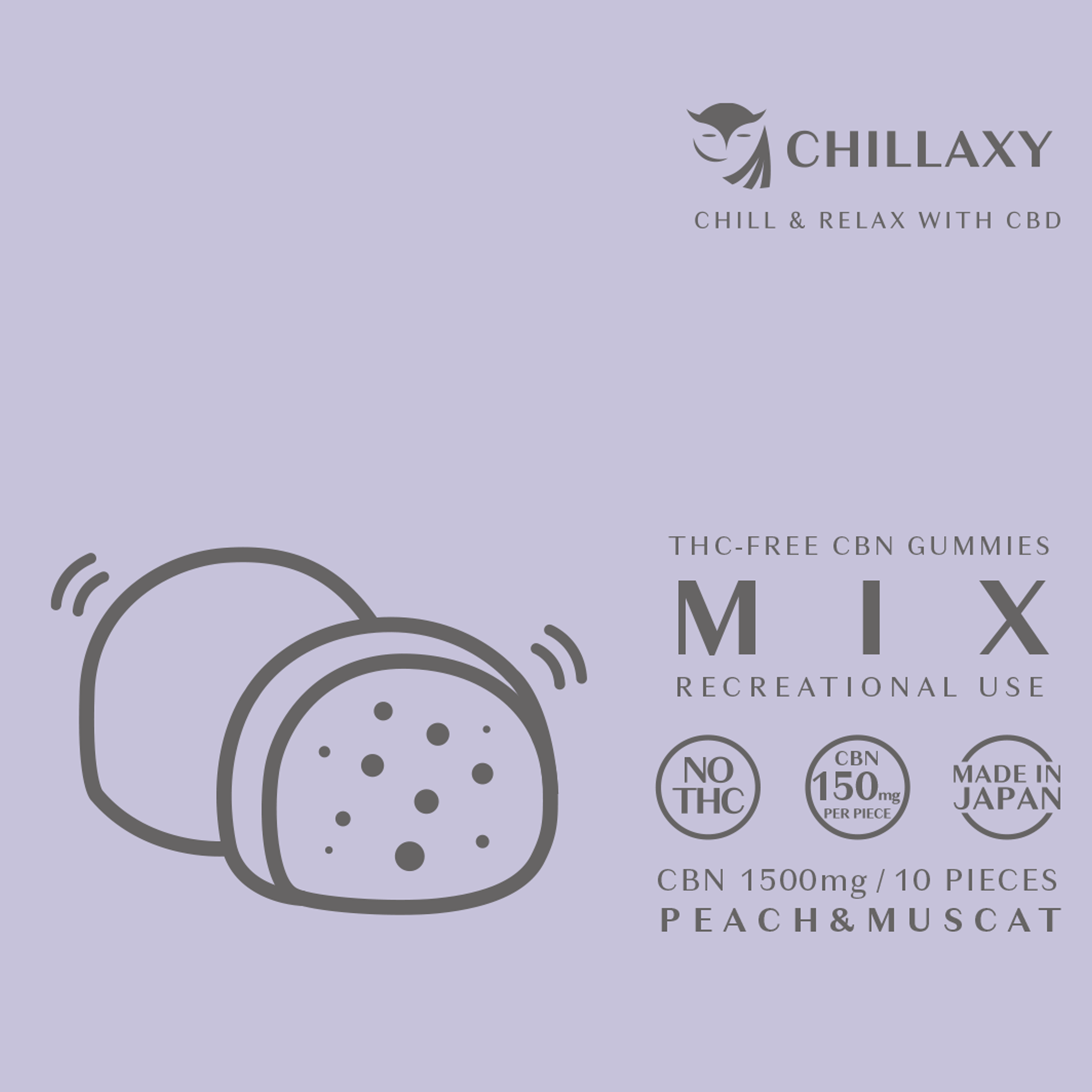 グミ1粒にCBN 150mg配合したCBNグミです。甘くてジューシーな完熟桃の風味が広がるフルーティーな味わいのピーチフレーバーと、みずみずしく爽やかな甘さが広がるフレッシュな味わいのマスカットフレーバーのセットです。1~2粒食べると心地よいまったり感、3~4粒食べるとしっかり満足感を得ることができるレクリエーション性があります。仕事終わりに一息つきたいときにおすすめです。お酒との併用はお控えください。