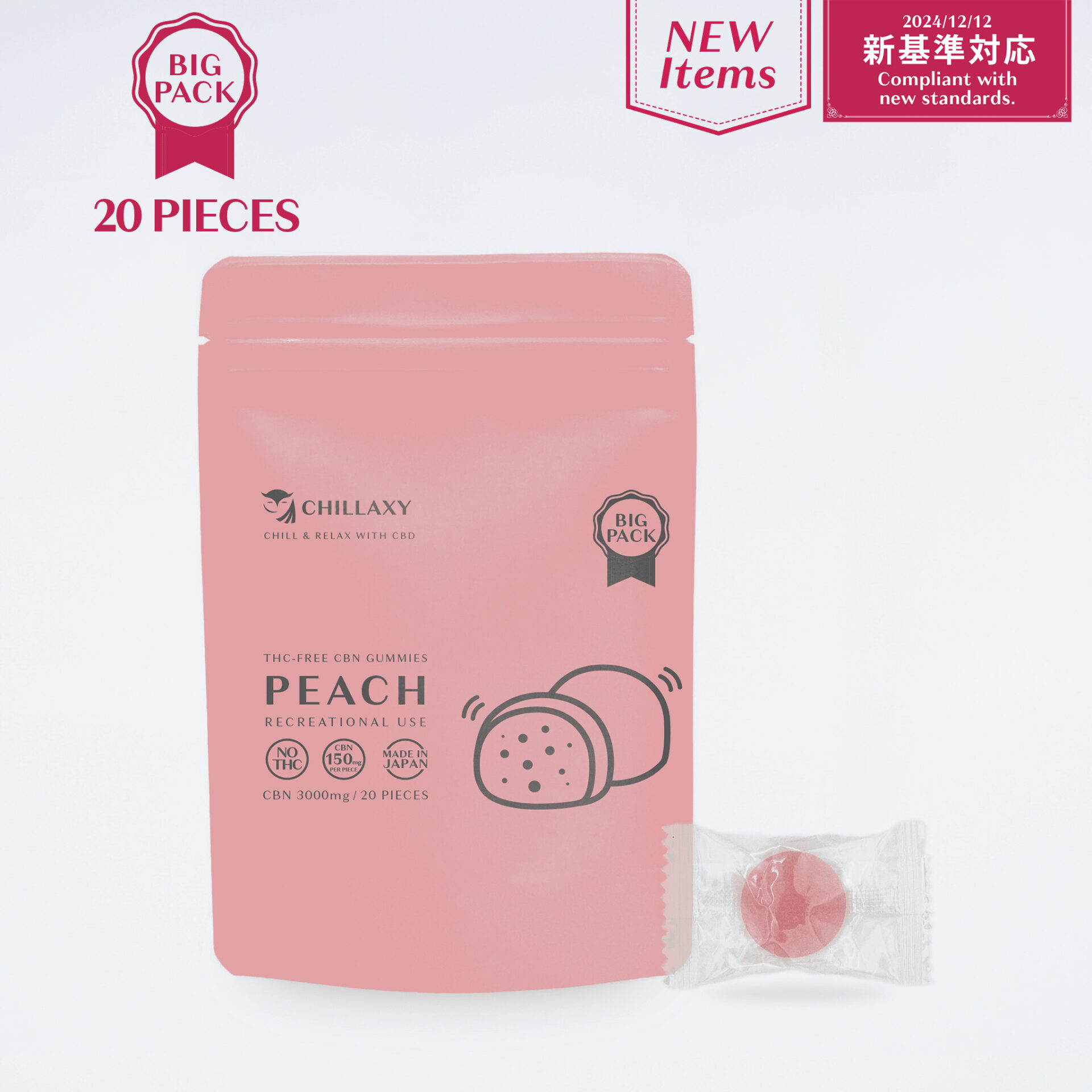 グミ1粒にCBN 150mg配合したCBNグミです。甘くてジューシーな完熟桃の風味が広がるフルーティーな味わい。程よい酸味がアクセントになり、爽やかで飽きのこない美味しさが楽しめます。1~2粒食べると心地よいまったり感、3~4粒食べるとしっかり満足感を得ることができるレクリエーション性があります。仕事終わりに一息つきたいときにおすすめです。お酒との併用はお控えください。