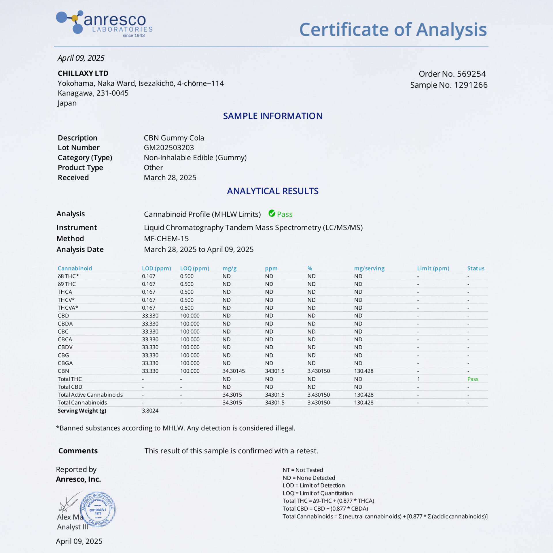・カンナビノイド量:CBN 750 / 3000mg