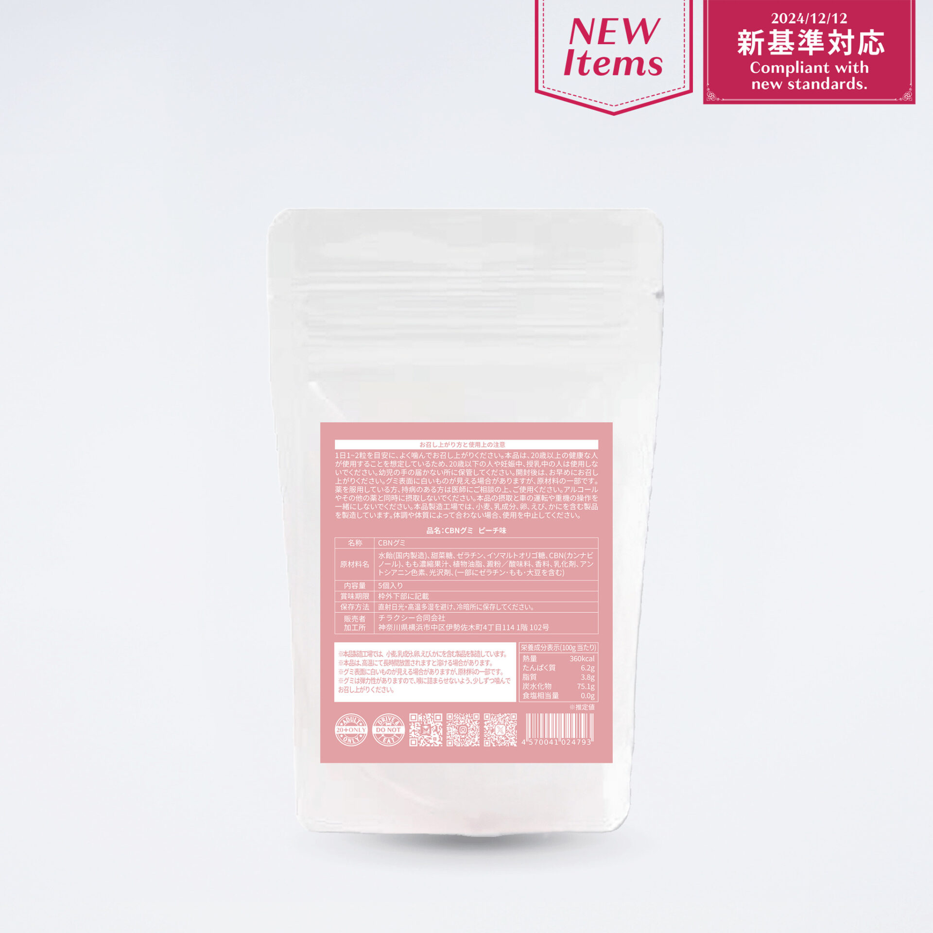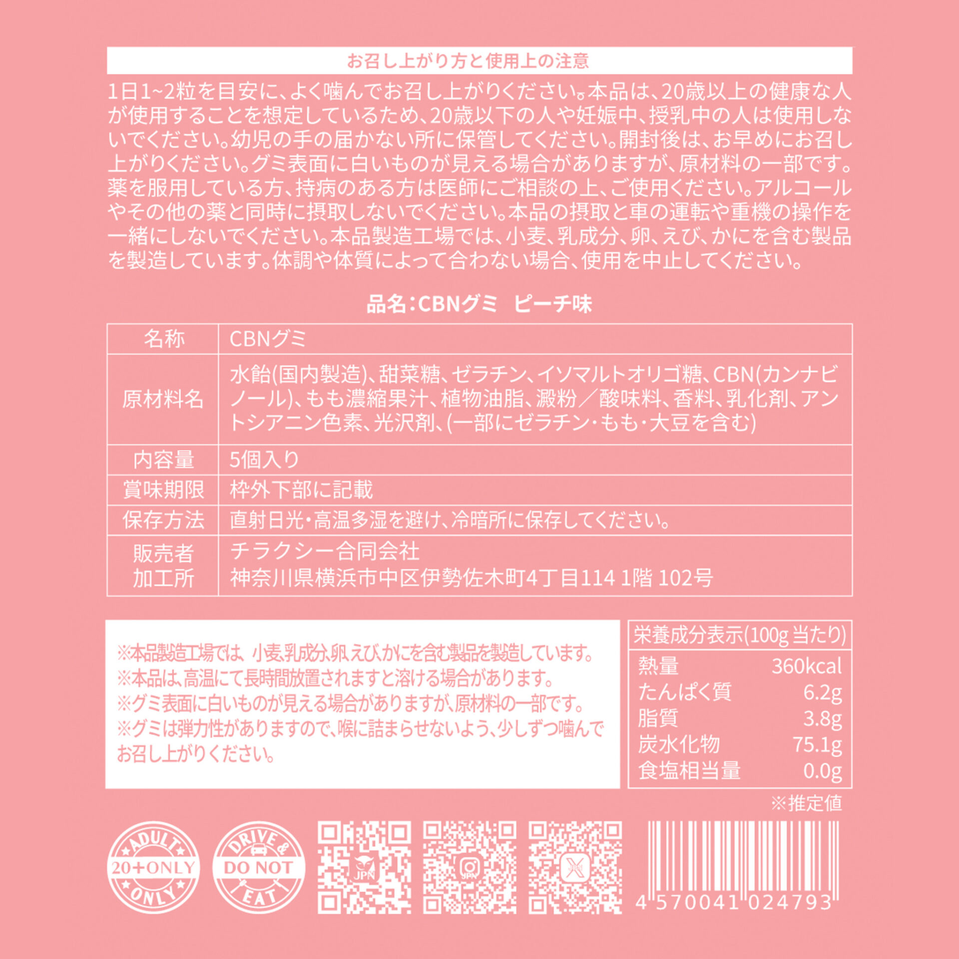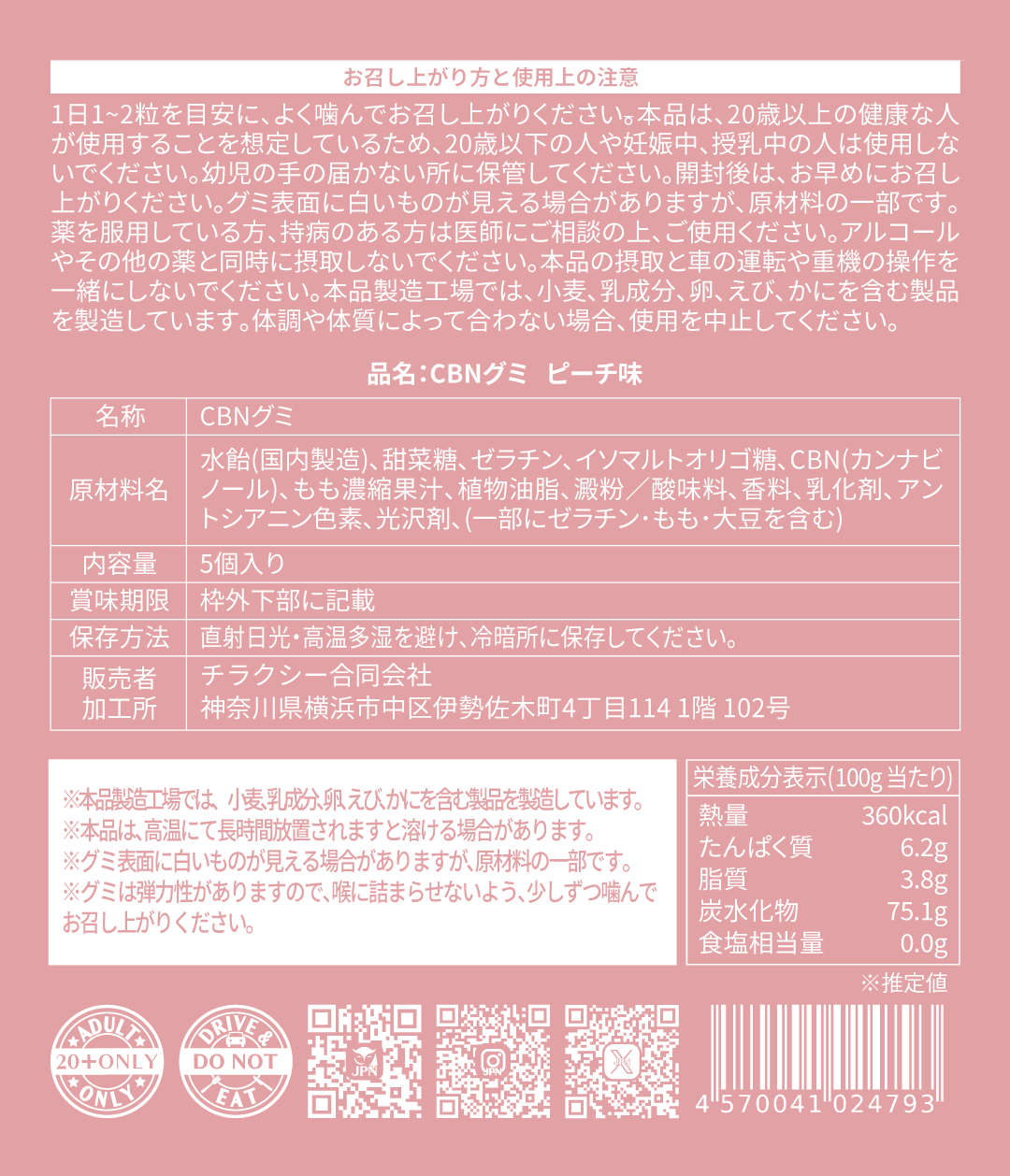 ・原材料:水飴(国内製造)、甜菜糖、ゼラチン、イソマルトオリゴ糖、CBN、もも濃縮果汁、植物油脂、澱粉/酸味料、香料、乳化剤、アントシアニン色素、光沢剤、(一部にゼラチン・もも・大豆を含む)