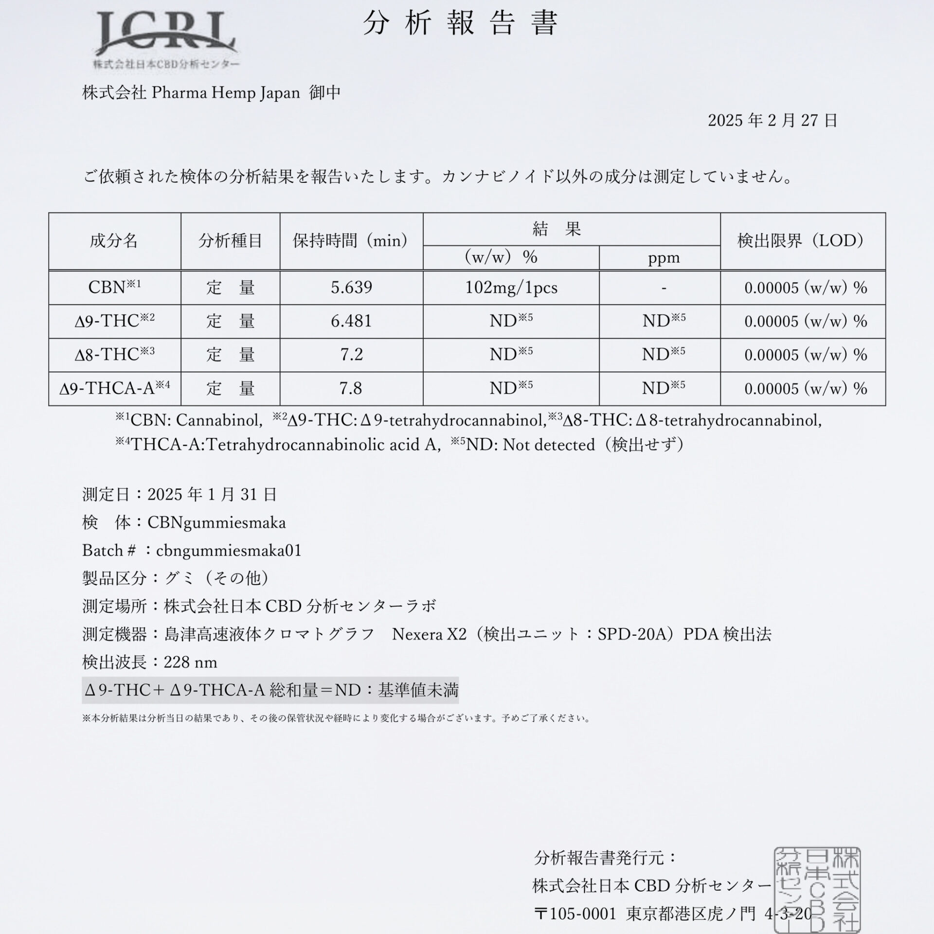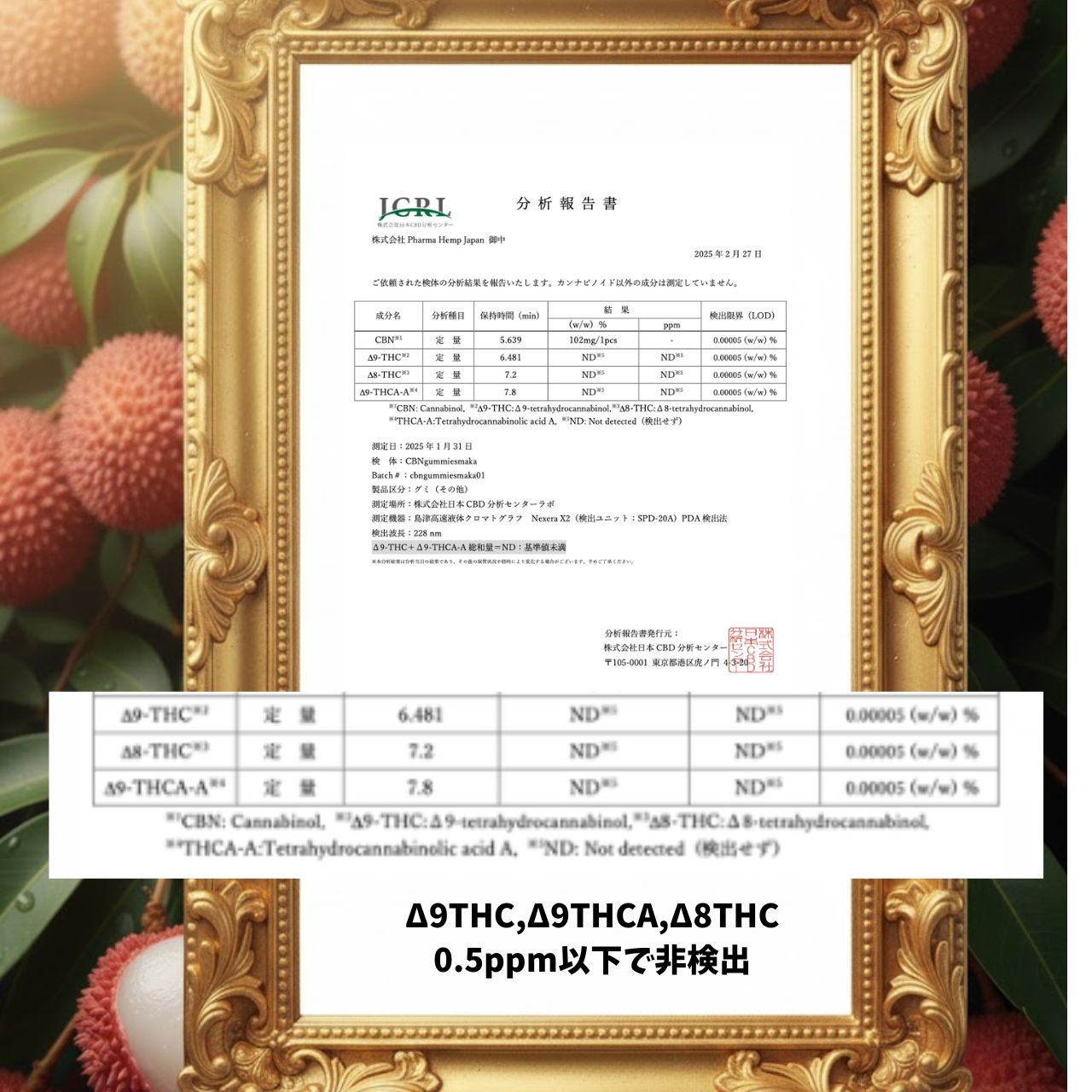 ・原材料:水飴、砂糖、ぶどう糖、CBN、マカ、ライチ果汁/酸味料、ペクチン、香料