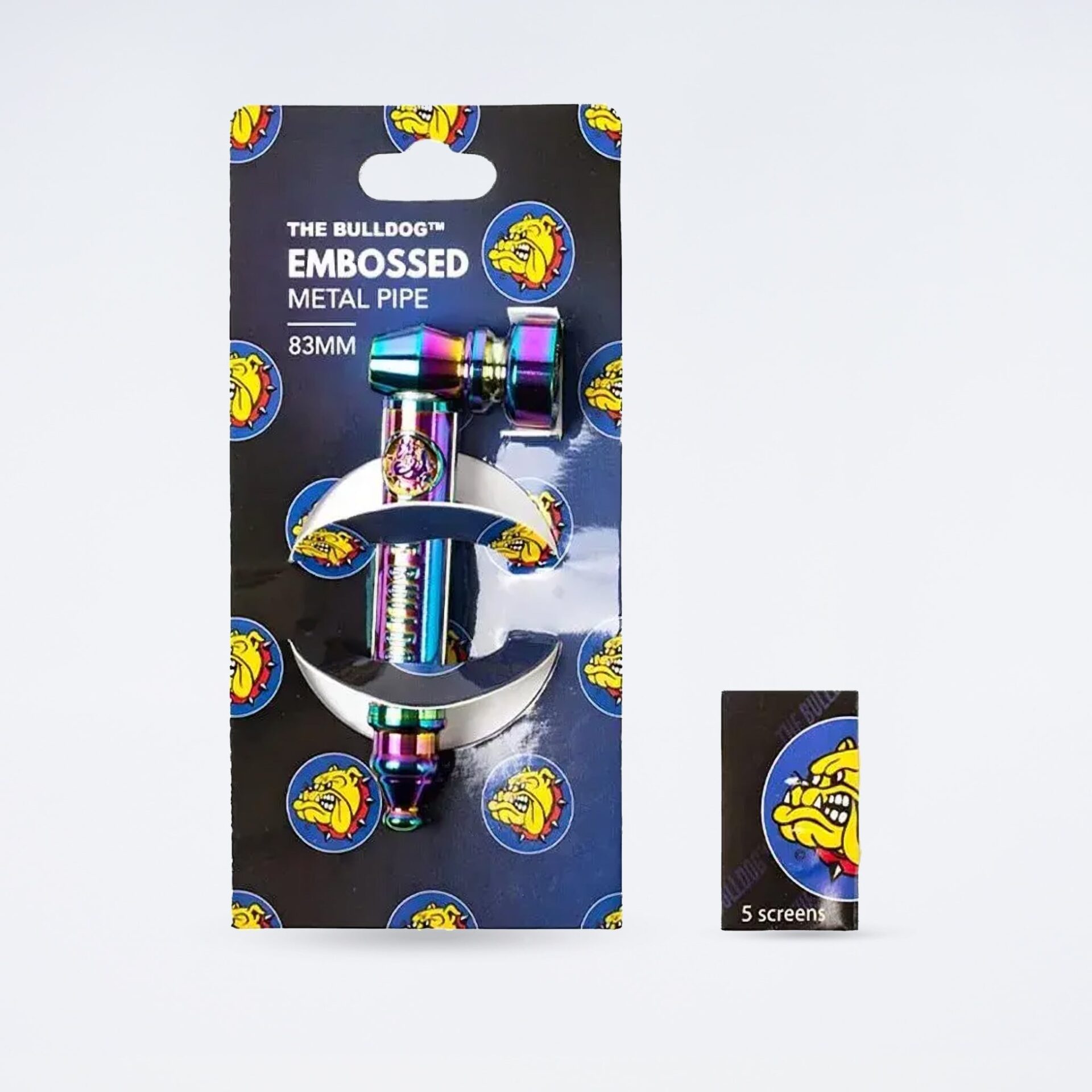 エンボス加工のブルドッグのロゴが入ったスタイリッシュで高級感のあるレインボーカラーのメタルパイプです。