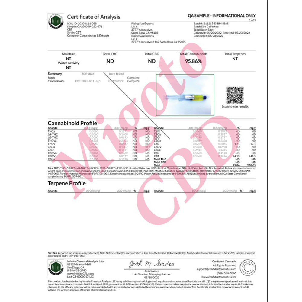 【MIGOTO社製】のCBTディストレートです。CBTは日本在来種やジャマイカ種などの品種で生成されるレアカンナビノイドです。CBDに似た役割を持っており、複数のカンナビノイドと一緒に摂取することで相乗効果が見込めます。また、CBTはベイプリキッドの結晶化を防ぐのにもオススメです。麻薬取締部に事前の輸入許可を得たうえで、独自にTHC検査をし、輸入しますので安心安全に原料をご使用頂けます。本品は、カンナビノイドの知識をお持ちの事業者向けの商品のため、一般消費者の方のご購入・ご使用はお控えください。